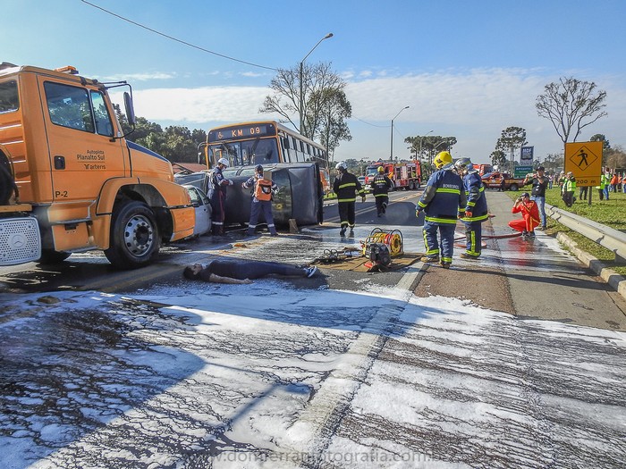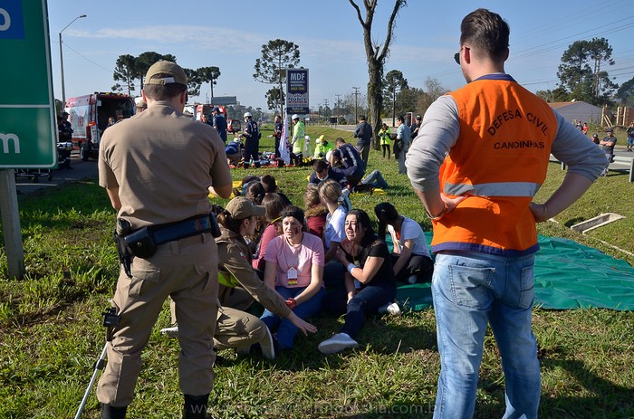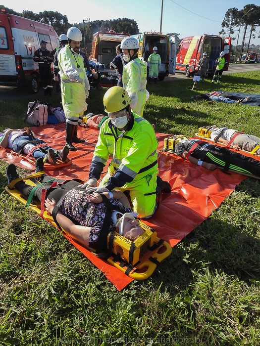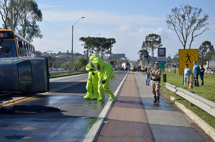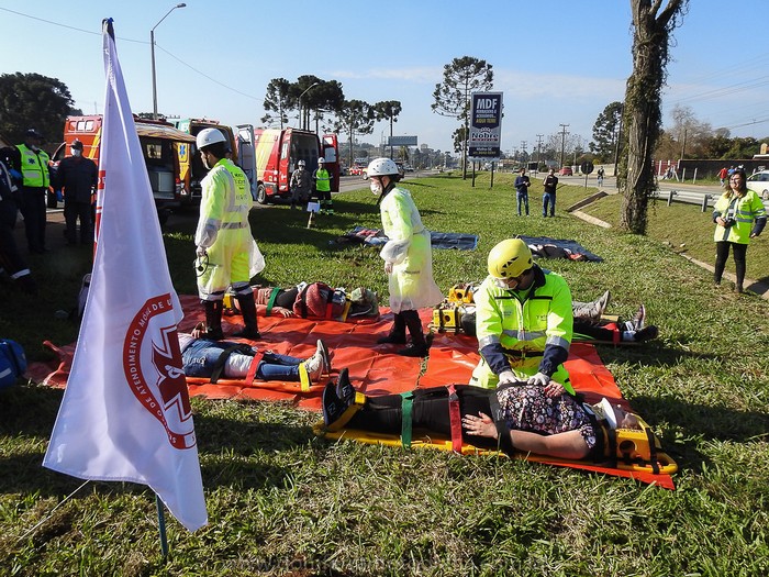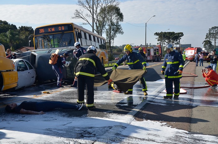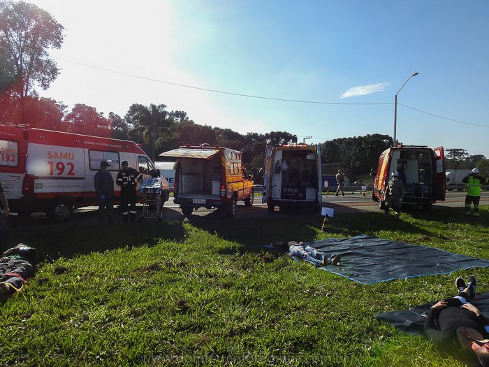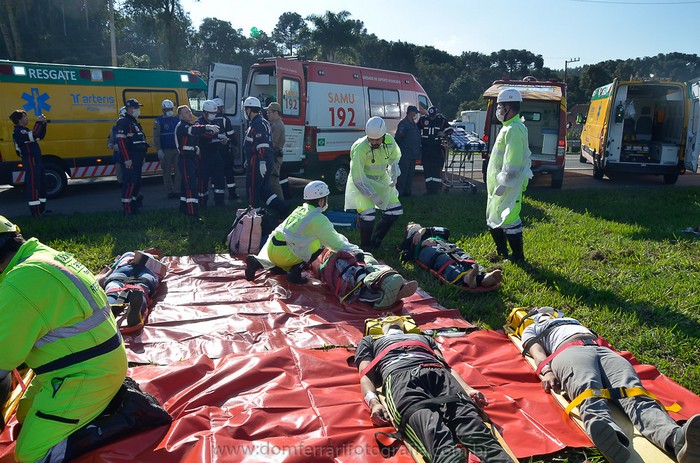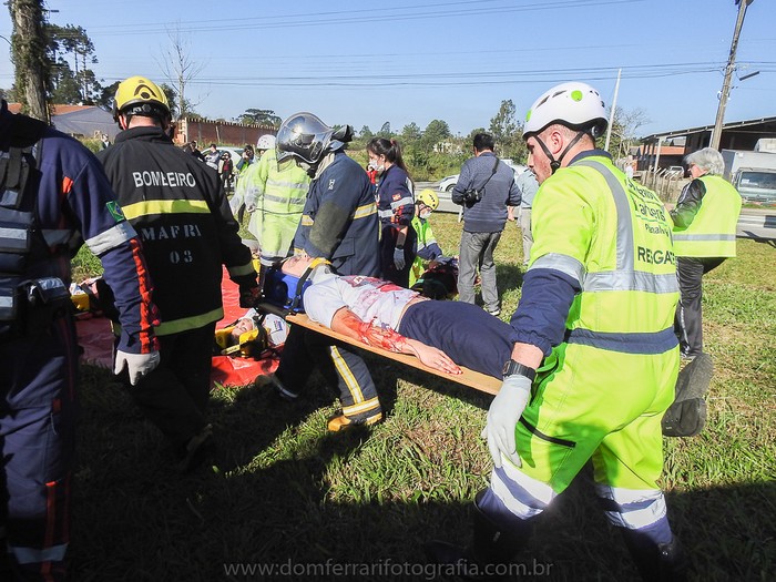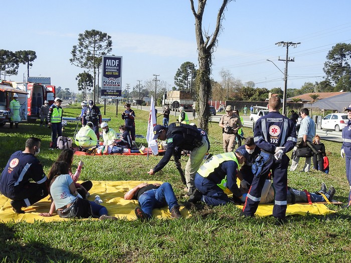 O cenário simulado foi o de um acidente de trânsito envolvendo um ônibus, dois carros e um caminhão de transporte de produtos perigosos carregado com diesel. Ao todo foram 25 vÃtimas com diversos graus de complexidade, inclusive com óbito no local. Todas as vÃtimas foram conduzidas as unidades hospitalares e de pronto atendimento de Mafra e Rio Negro.