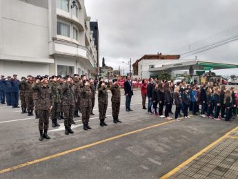 Na manhã da última segunda-feira (02), aconteceu na Praça Hercílio Luz a abertura oficial da Semana da Pátria, com cerimônia de hasteamento das bandeiras e apresentações de escolas das redes municipal e estadual de ensino. Participaram da solenidade o Prefeito de Mafra, Wellington Bielecki, o presidente da Câmara de Vereadores, Valdir Sokolski, o Comandante do 5º RCC, Tenente Coronel Gustavo Henrique Araújo Pereira Machado, o Comandante da 11ª Bateria de Artilharia Antiaérea Autopropulsada, Major Abner de Oliveira e Silva Junior, representantes do Corpo de Bombeiros e da Polícia Militar de Mafra e de Rio Negro, além de Vereadores, Secretários Municipais e público em geral.
