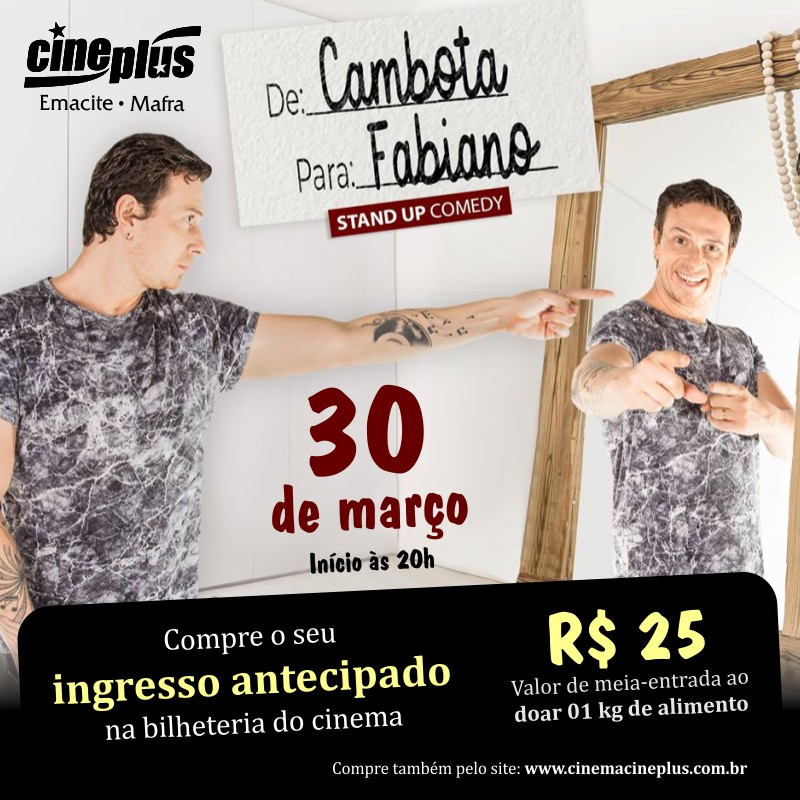 Atualização: A Rede Cineplus comunica que o show de stand up com o humorista Fabiano Cambota, agendado inicialmente para o dia 30 de março no Cineplus Mafra, será adiado. A nova data ainda será definida. Quem já adquiriu o ingresso deve guarda-lo para utilizar assim que houver a definição da nova data. A Rede Cineplus agradece pela compreensão de todos.