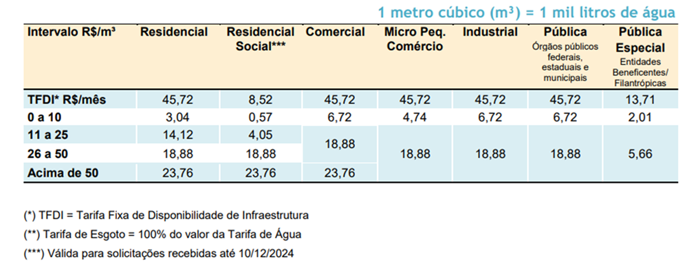 A correção foi de 5,56% e será aplicada a partir de 1º de março de 2025 nas tarifas de água, esgoto e na tabela de serviços e infrações. Os novos valores foram calculados com base no Índice Nacional de Preços ao Consumidor Amplo (IPCA), indicador oficial da inflação no Brasil. O percentual corresponde ao acumulado do IPCA entre abril/2023 e setembro/2024.