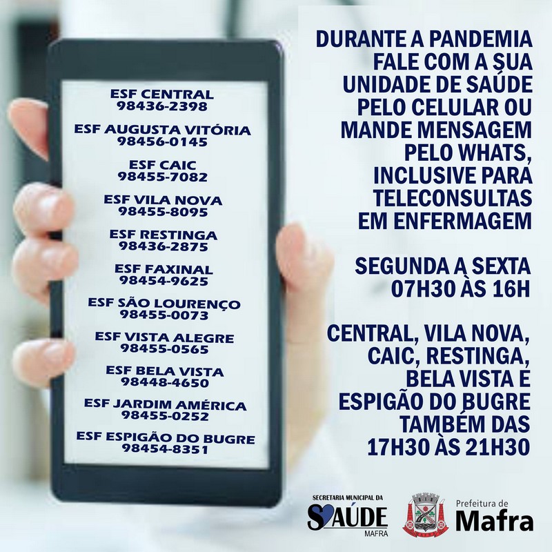 A prefeitura de Mafra divulgou os telefones atuais de contato das unidades de saúde de Estratégia Saúde da FamÃlia (ESF).