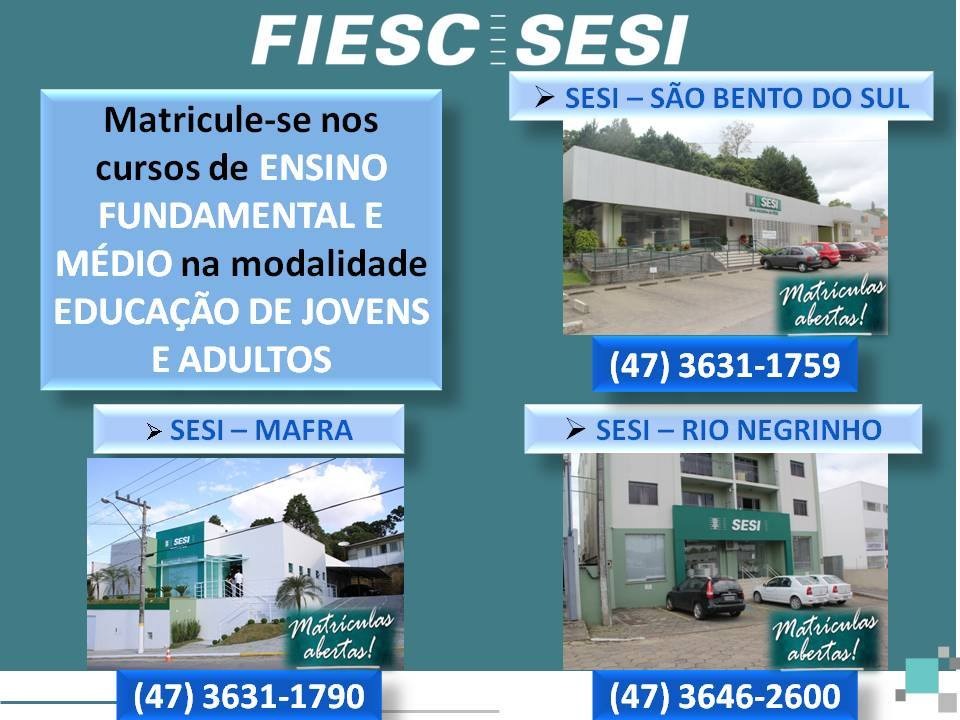 Para se matricular, é necessário comparecer na unidade do SESI de Mafra, situada na Rua Campos Salles, nº 130. Mais informações podem ser obtidas através dos contados: (47) 3631-1790 / 98433-1184.