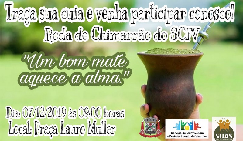 A Prefeitura de Mafra, por meio da Secretaria Municipal de Assistência Social e Habitação, informa que neste sábado, dia 07 de dezembro, acontece a mais famosa e animada “Roda de Chimarrão” promovida pelo Serviço de Convivência e Fortalecimento de Vínculos, a partir das 9 horas da manhã na Praça Lauro Müller.