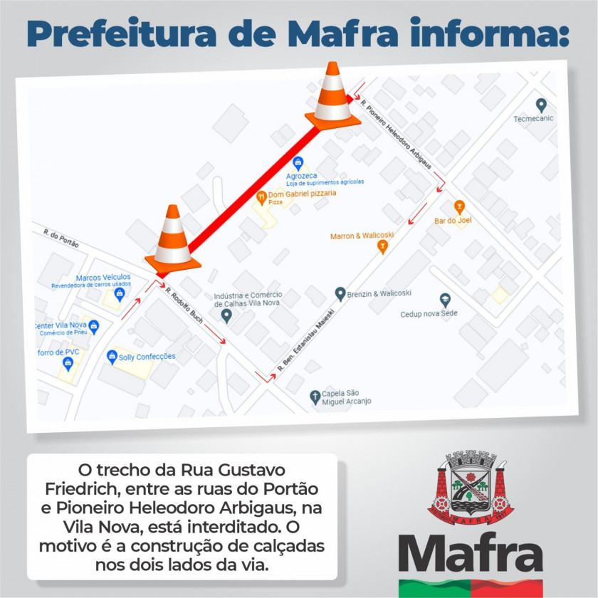 A Prefeitura de Mafra está intensificando obras para proporcionar melhorias na área urbana do municÃpio. Pensando na benfeitoria a pedestres, o trecho da Rua Gustavo Friedrich, entre as ruas do Portão e Pioneiro Heleodoro Arbigaus, na Vila Nova, está recebendo a construção de calçadas nos dois lados da via.