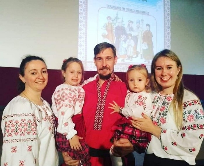 Vinisia Bossi e sua família vestidndo camisas bordadas representativas da cultura Ucraniana