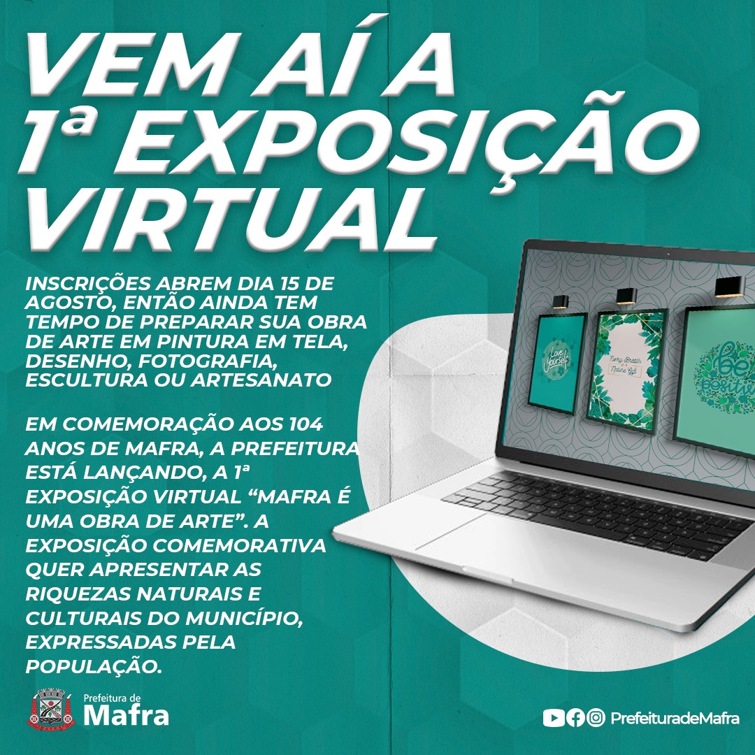 Em comemoração aos 104 anos de Mafra, a Prefeitura está lançando por meio da Secretaria Municipal de Educação, Esporte e Cultura, a 1ª Exposição virtual “Mafra é uma obra de arte”. A exposição comemorativa quer apresentar as riquezas naturais e culturais do município, expressadas pela população.