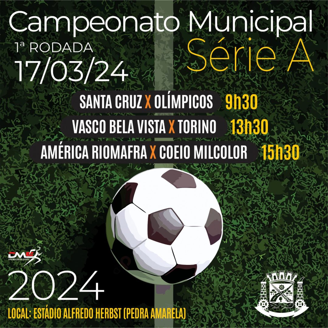 A Prefeitura de Mafra, através do Departamento Municipal de Esportes, convida a população para prestigiar os jogos do Campeonato Municipal de Futebol de Campo.  Ao todo serão 10 equipes participantes disputando o tÃtulo do campeonato, na Série A:  América Riomafra, Butuca FC, Coeio Futebol Clube/Milcolor, Posto Mallon, Santa Cruz, Torino Futebol Clube, OlÃmpicos, Dynamo FC, Vasco Bela Vista e Cruzeiro FC.A 1ª rodada será no próximo dia 17, no Estádio Municipal Alfredo Herbst, com jogos à s 9h30, 13h30 e 15h30, conforme tabela abaixo: