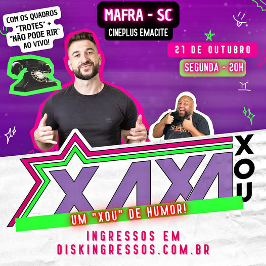 Garanta agora o seu ingresso: https://www.diskingressos.com.br/evento/7759/21-10-2024/sc/mafra/xaxa-xou-um-xou-de-humor