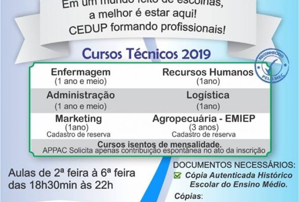 Inscrições para os cursos técnicos do CEDUP iniciam no dia 19