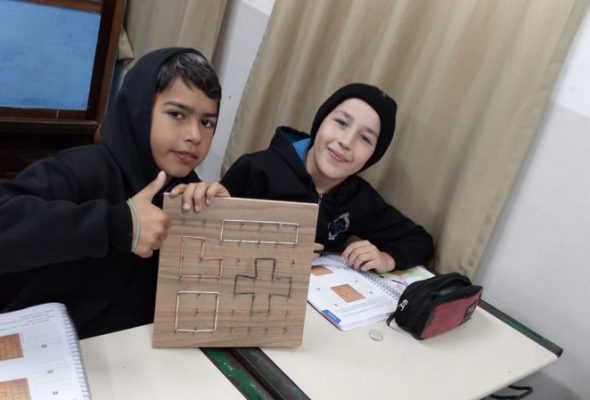 5º ano da EMEB Professor Mário de Oliveira Goeldner trabalha na prática formas geométricas planas...