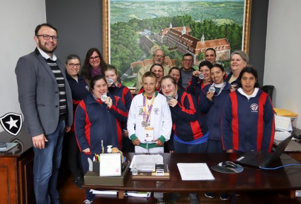 Alunos atletas da Escola Tia Apolônia visitam o gabinete do prefeito