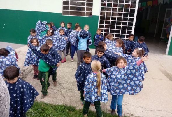 Alunos da escola Vila Olsen recebem ponchos para o inverno