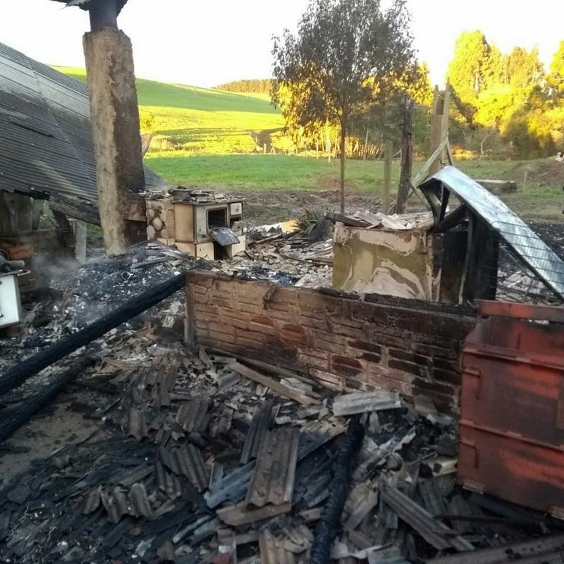 O incêndio atingiu uma edificação construÃda em madeira, com aproximadamente 180 metros quadrados, com cobertura de telhas de fibrocimento.