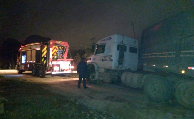 O motorista da carreta com a ajuda dos bombeiros conseguiu colocar o veÃculo num lugar seguro.