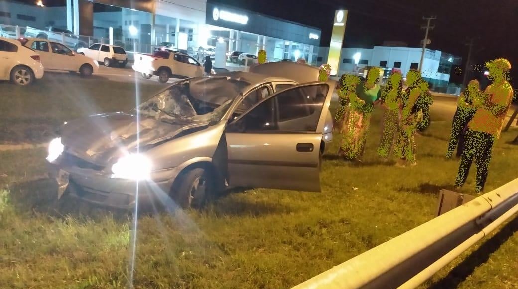 O condutor, um masculino de 44 anos, encontrava-se fora do veÃculo em decúbito dorsal sobre a grama, estando consciente e orientado, apresentando vários ferimentos na face, região frontal do crânio, algia cervical e suspeita de luxação no ombro direito.