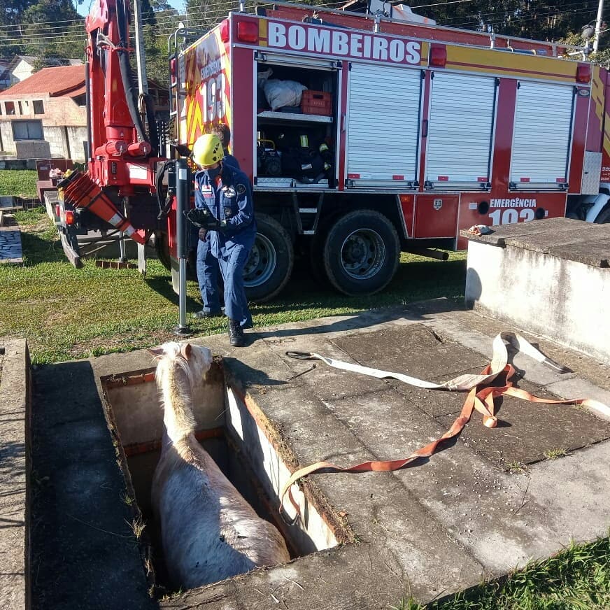 Por volta das 09h deste domingo (23), a guarnição do ABTR-100 do Corpo de Bombeiros de Mafra deslocou-se a Rua Santa Cruz, Vila Ivete, a fim de realizar o resgate de um cavalo que havia caÃdo em um túmulo no Cemitério Municipal.