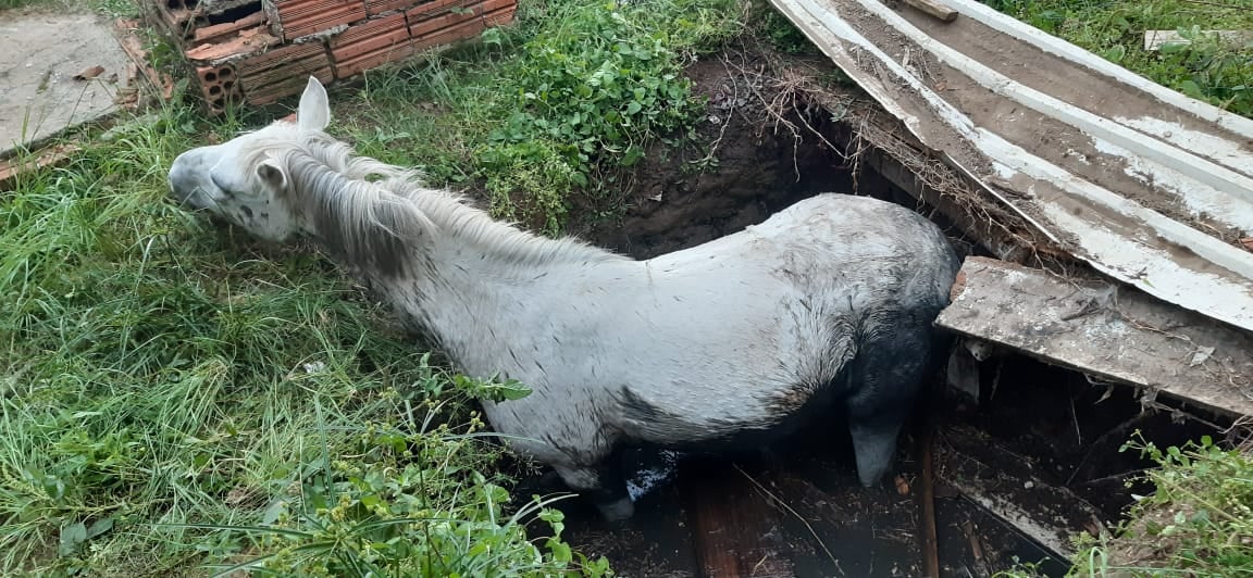 Ao chegar ao local nos deparamos com um equino (égua de 4 anos), atolada no interior de uma fossa tipo sumidouro. Após avaliação, as equipes decidiram escavar uma rampa para o animal usar de base de apoio e com o auxÃlio de cabos e fitas dando um impulso no animal para ajudar na saÃda.
