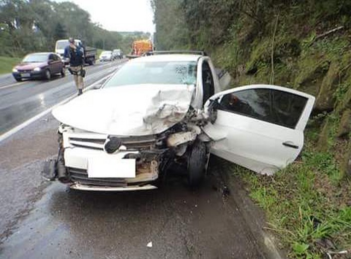 Ele seguia viagem, acompanhado de seu filho e um amigo de seu filho, ambos de 16 anos de idade, quando foi surpreendido pelo veÃculo VW/Saveiro, placas de Videira, que ao tentar ultrapassar um caminhão, acabou batendo de frente com o Fiat/Uno de Vendelino, que vinha em sentido contrário e nada pode fazer.