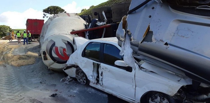 Neste grave acidente que bloqueou totalmente a pista da BR-116, uma carreta carregada com tubulação veio a tombar e acabou atingindo outros três caminhões e o veÃculo Fiat/Siena, que estava à professora e ficou prensado.