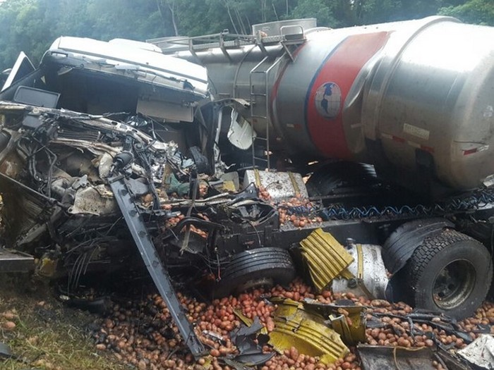 Ainda conforme a concessionária, uma parte da carga de batatas do caminhão bitrem se derramou sobre a pista. O caminhão tanque estava carregado com resina de MDF, segundo a concessionária.