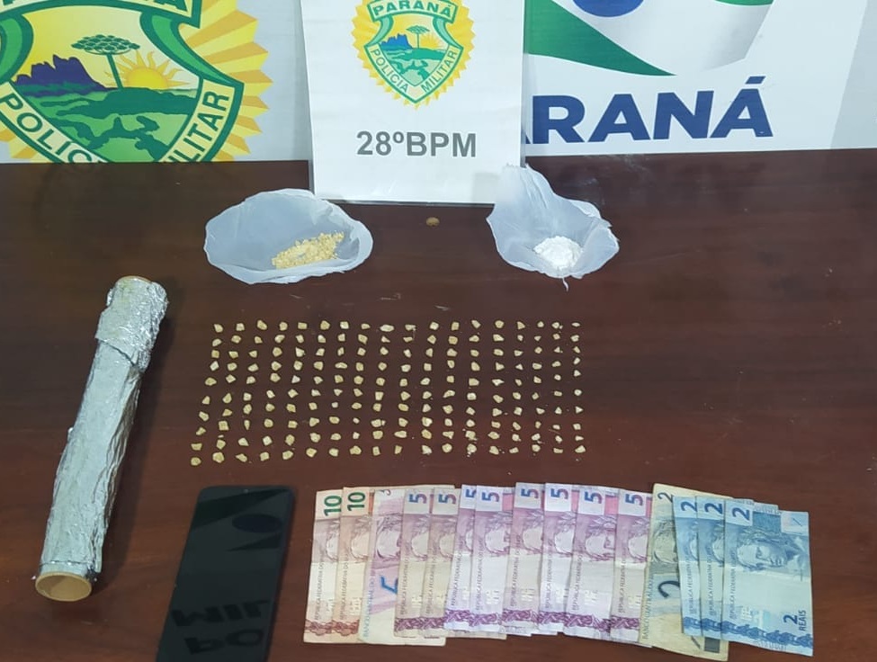 Na busca pessoal foi apreendido 10g de cocaÃna e 180 pedras de crack. O homem foi preso e encaminhado à Delegacia.