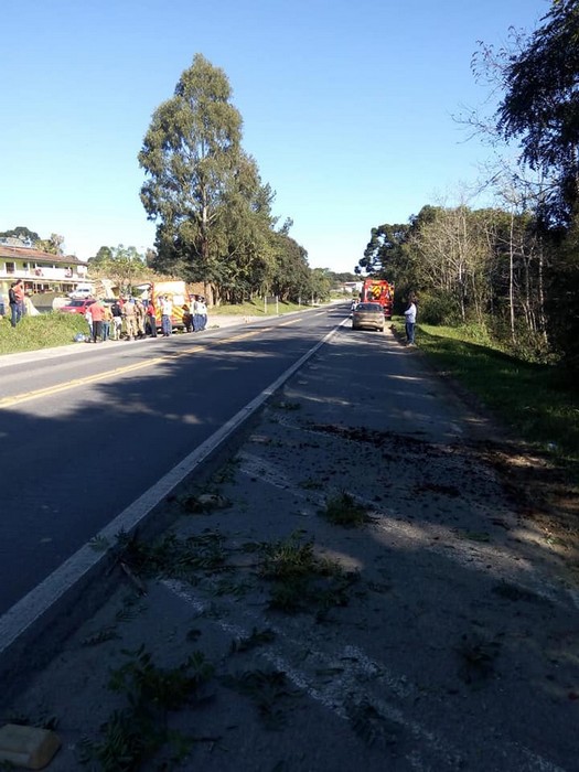 No local havia um homem (Nelson Ozika) de 37 anos caÃdo no acostamento em decúbito lateral esquerdo com ausência total de sinais vitais. Segundo testemunhas, o mesmo estava conduzindo e veio a cair de um trator que se encontrava no outro lado da rodovia, o qual aparentemente seguiu desgovernado até bater em uma árvore. Após procedimentos o Corpo de Bombeiros deixou o local aos cuidados da PolÃcia Rodoviária Federal e IGP.