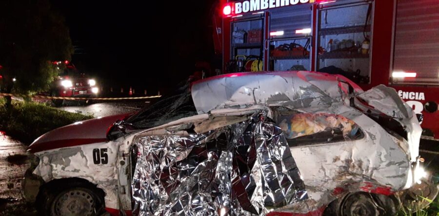 O Corpo de Bombeiros precisou cortar a porta do veÃculo para retirar o corpo que ficou sob responsabilidade do Instituto Geral de PerÃcias. Os militares verificaram que havia um cilindro de gás natural veicular no Chevrolet/Celta, o que inspirou cuidados devido o risco de incêndio. O motorista do caminhão, um homem de 44 anos, estava sem ferimentos.