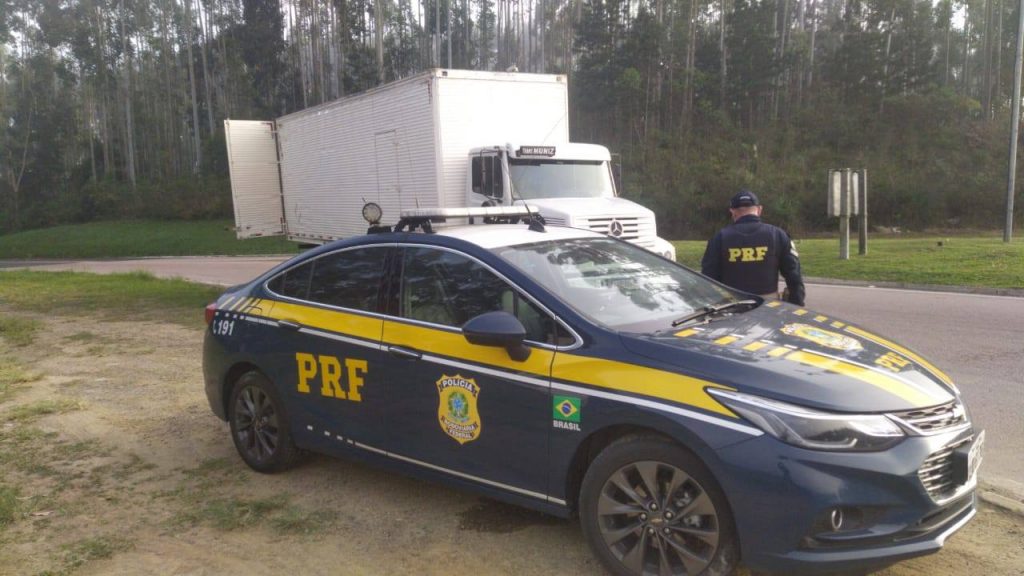 O motorista de um M/Benz baú placas de Jaraguá do Sul não obedeceu ordem de parada e fugiu em alta velocidade. Em seguida, ele abandonou o veÃculo e correu para a mata fechada à s margens da rodovia, não sendo mais localizado.