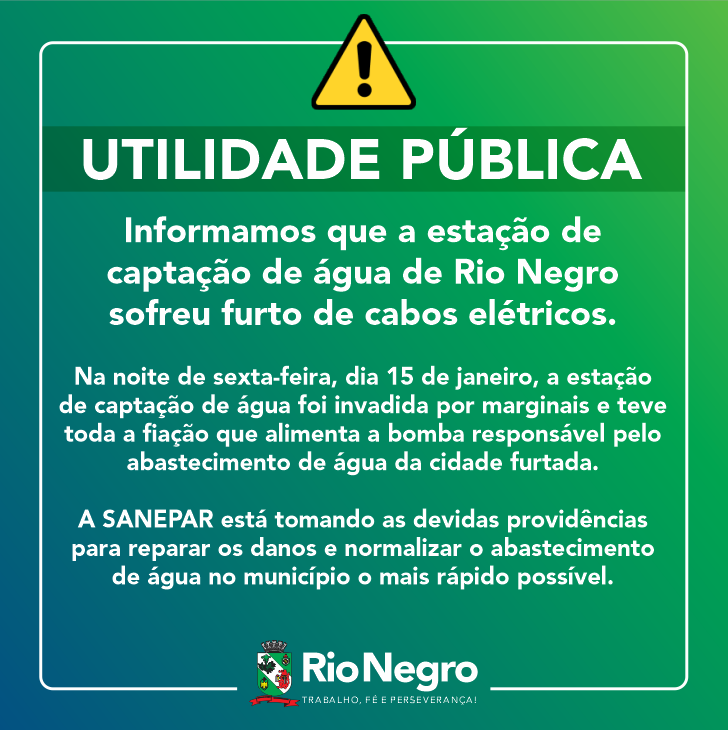 Na noite desta sexta-feira (15), a estação de captação de água de Rio Negro sofreu furto de cabos elétricos. Ela foi invadida por marginais e teve toda a fiação que alimenta a bomba responsável pelo abastecimento de água da cidade furtada.