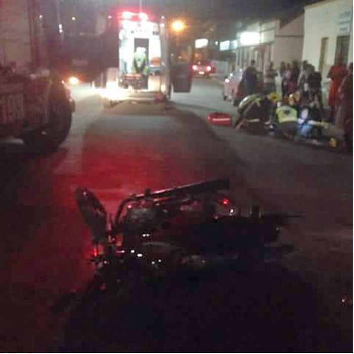 O condutor da motocicleta de 19 anos de idade encontrava-se caÃdo em decúbito dorsal sobre a via, estava consciente e orientado, apresentando suspeita de fratura no joelho direito e com escoriações e se queixava de algia nos dedos.