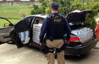 No veÃculo Hyundai/Azera, com registro de furto no Paraná, os policiais apreenderam cerca de 20 mil maços de cigarros contrabandeados do Paraguai, aproximadamente dois mil pacotes, avaliados em 100 mil reais.