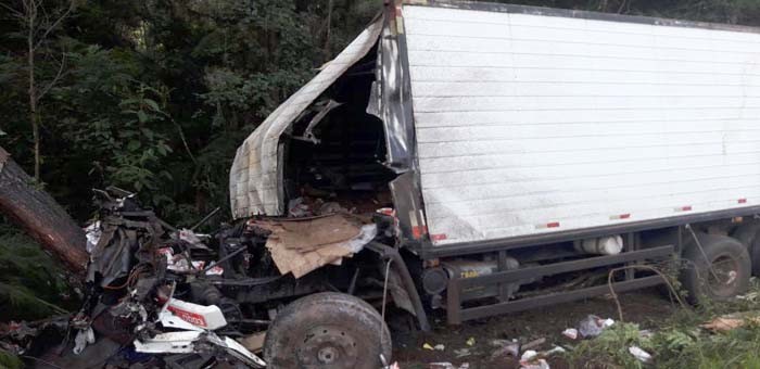 Devido o forte impacto o caminhão ficou totalmente destruÃdo e o motorista infelizmente ficou preso entre as ferragens e teve uma morte de forma trágica.