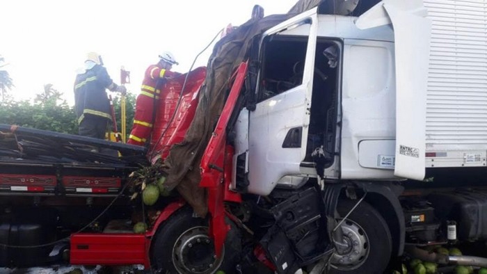 O motorista Fernando Ficanha de Itaiópolis colidiu de frente o seu caminhão, carregado de coco, contra outro caminhão na cidade de Guarapari no estado do Espirito Santo.