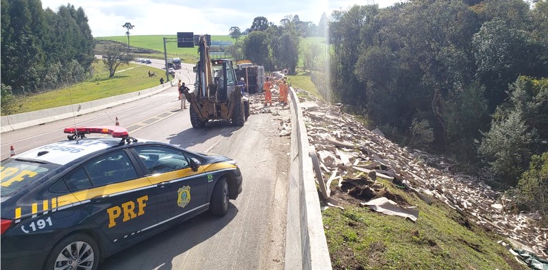 Na manhã desta segunda-feira (13/07) a PolÃcia Rodoviária Federal, foi acionada para atender um acidente de trânsito na BR-116 no km 202 em Rio Negro, envolvendo um caminhão carregado de papel que veio a tombar. Segundo informações da Policia Rodoviária Federal o motorista teve apenas ferimentos leves. O acidente deixou a pista sentido Curitiba, interditada por cerca de duas horas com o trânsito seguindo no sistema pare e siga.A Autopista Planalto Sul realizou o destombamento do caminhão e a limpeza da pista, posteriormente foi liberada em ambos os sentidos.