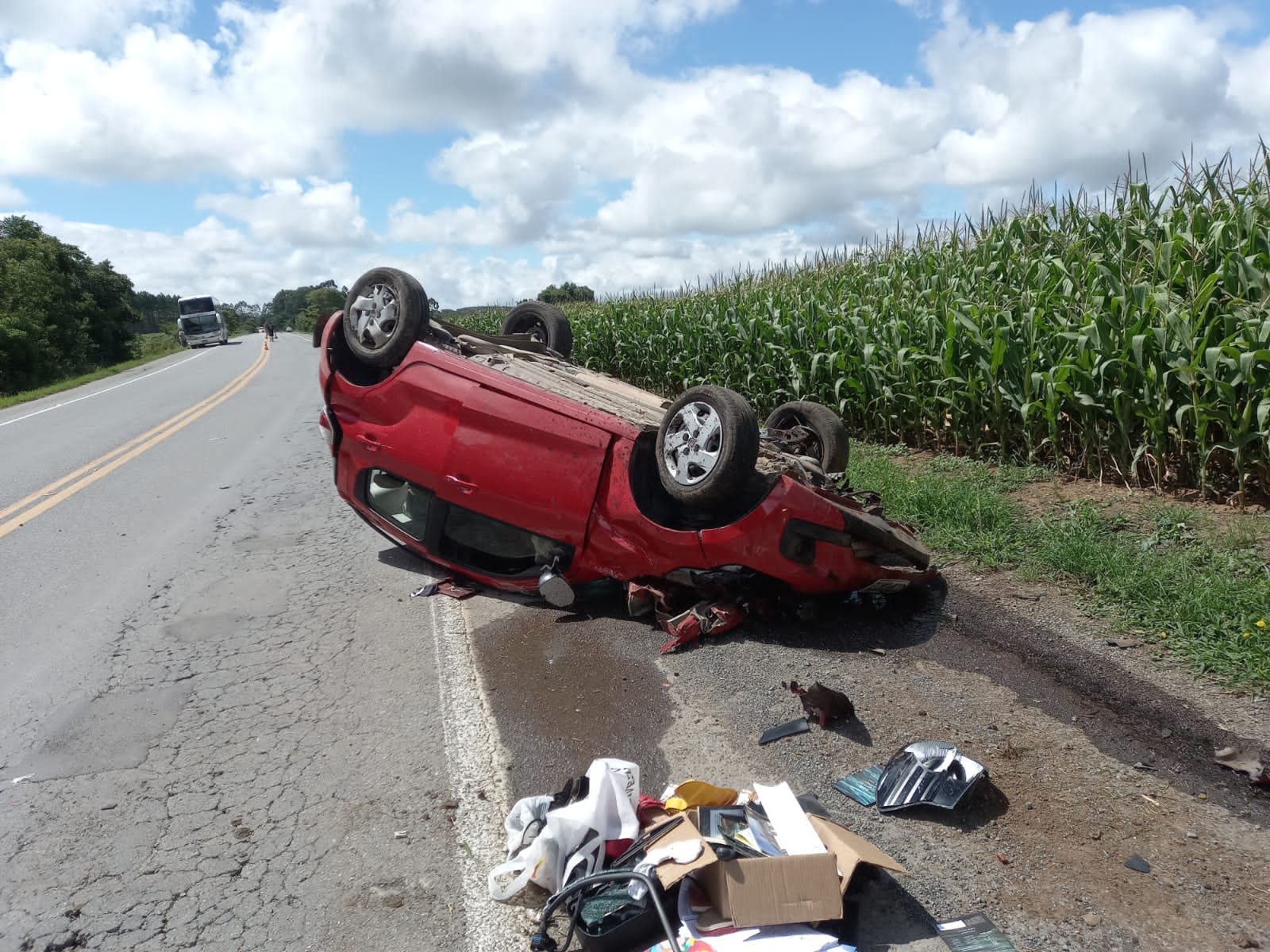 Ao chegar no local foi constatado o capotamento do veiculo Fiat/Mobi Like, vermelho, 2017, placas de Joinville-SC, tendo como condutora uma feminina, 43 anos, encontrada fora do veiculo, deitada as margens da rodovia, amparada por brigadistas voluntários da cidade de Caçador-SC. Apresentava-se consciente, confusa, referindo dores na cabeça e escoriações em membros superiores.