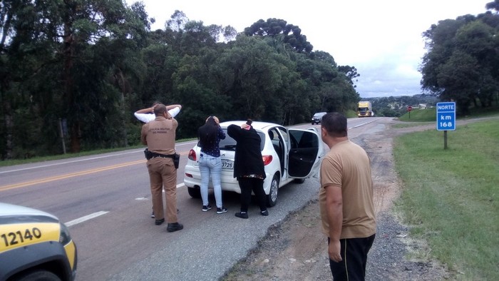 A equipe da PM recebeu denúncia que um veículo Peugeot 207, placas AWY-3725 de Curitiba, com duas mulheres e um masculino estariam se deslocando da cidade de Rio Negro, sentido a Curitiba carregado com produtos provenientes de furtos de lojas de roupas da região.