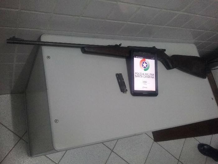 A motocicleta estava com dois ocupantes, sendo um homem de 43 anos e o outro de 49 anos e estavam portando um rifle calibre 22, com uma munição deflagrada e mais um carregador com oito munições intactas, todas do mesmo calibre.