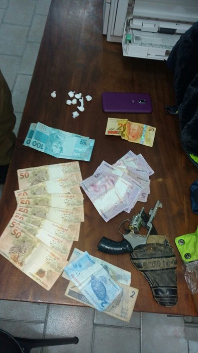 Os suspeitos ao avistarem as viaturas da PolÃcia Militar, ambos empreenderam fuga mais foram capturados, durante o cerco rapidamente montado pelos policiais militares. Durante a revista pessoal foram encontrados com os mesmos, oito “buchas” de cocaÃna, dinheiro, um revólver calibre 22 com a numeração raspada e 04 munições de mesmo calibre.