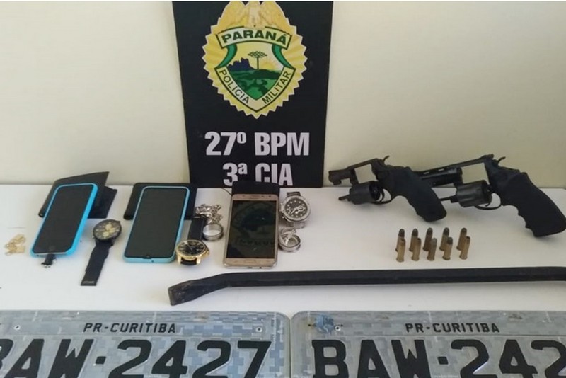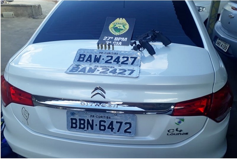 Em revista pessoal nada de ilícito foram encontrados com os três elementos, mas em busca veicular foi encontrado uma arma de fogo calibre 38 municiados. Os policiais ao consultar a placa do Citroem, constataram que o veículo, estava com placas clonadas, bem como o número do chassi, constava que tinha alerta de roubo em Curitiba.
