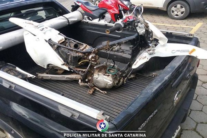 Os policiais desconfiados da procedência desta motocicleta consultaram o sistema integrado da Policia Militar e foi constatado ser uma motocicleta com placas de Ponte Alta do Norte/SC, a qual possuÃa registro de furto.