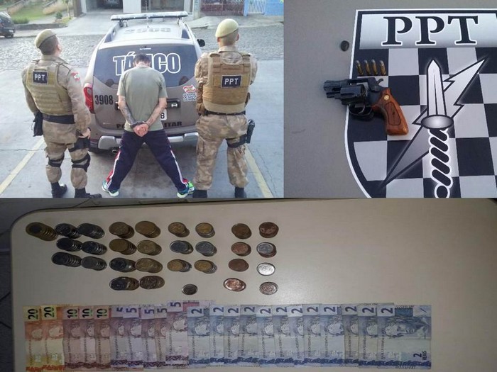 Durante a revista pessoal os policiais encontraram de posse do mesmo o revólver e o dinheiro (moedas) furtados na empresa.
