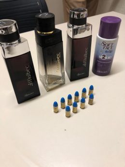 No interior da mochila de Maycon os policiais encontraram três frascos de perfume do Boticário/Malbec e um frasco tônico adstringente da citada perfumaria. Estes perfumes encontrados são de procedência duvidosa.