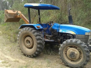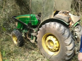 Eram duas máquinas agrÃcolas abandonadas, sendo uma da marca New Holland – modelo TT3840 na cor azul e a outra da John Deere – modelo 5425 na cor verde, ambas estacionadas na beira de uma ribanceira, que dá acesso a um arroio.