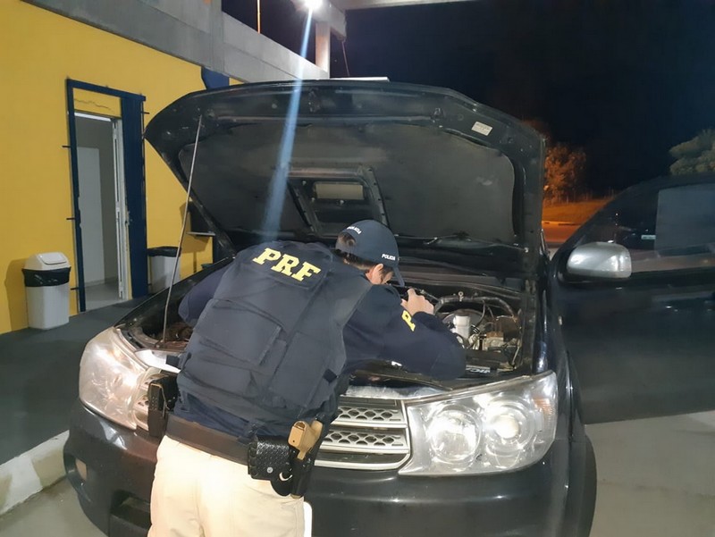 O motorista viajava com mais um passageiro e durante a fiscalização o mesmo apresentou o documento do veÃculo, suspeito de indÃcios de ser falsificado. Diante dos fatos os policiais realizaram uma fiscalização minuciosa e foi constatado que além da documentação ser falsa, havia sinais identificadores, como o número do chassi foi adulterado e as placas eram falsas.