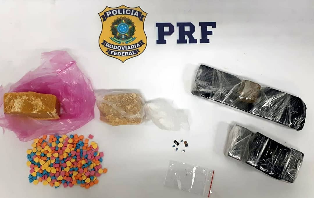 Policiais rodoviários federais apreenderam na noite de sábado (13), na BR 280 em Mafra, quase um quilo de maconha, 550g de crack, 250 comprimidos de ecstasy e ainda oito pontos de LSD (droga sintética).