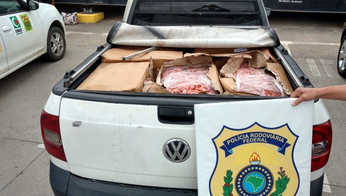 O veÃculo VW/Saveiro, com placas de Itapoá/SC, foi abordada em fiscalização de rotina. Além de ter entrada proibida no paÃs, o camarão era transportado sem nenhum sistema de refrigeração.