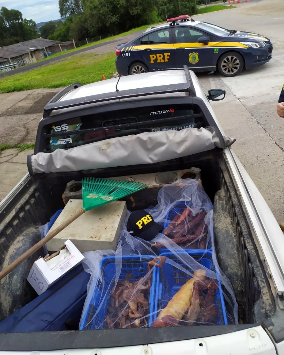 A mercadoria foi encontrada no compartimento de carga de uma VW/Saveiro, em meio a ferramentas agrícolas, sujeira e até algumas moscas. Havia salames, couro de porco, bacon e produtos defumados a céu aberto, sem nenhum tipo de refrigeração. O condutor disse que revenderia os alimentos no comércio varejista da cidade.