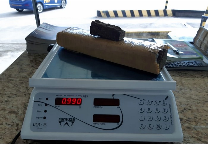 Os policiais durante revista pessoal encontraram um tijolo e um torrão de maconha, pesando 990 gramas que estava em baixo da jaqueta do passageiro de 37 anos de idade. Este elemento possuía 15 passagens policiais, por crimes de agressão á mulher e lesão corporal.
