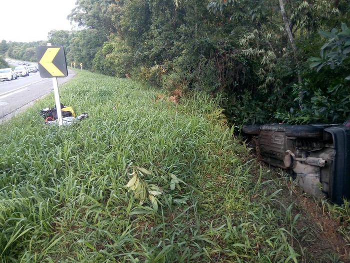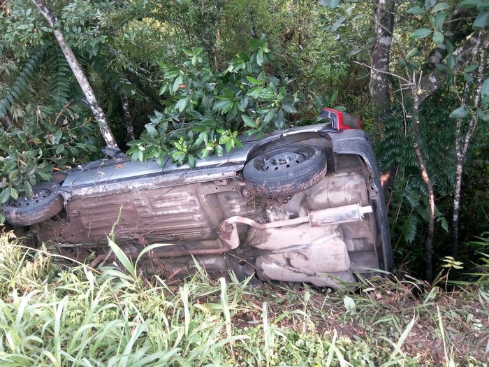 No banco dianteiro um masculino de 32 anos de idade, encontrava-se fora do veÃculo em pé as margens da rodovia e apresentava escoriação no antebraço. Como passageiro no banco de trás do veÃculo, um jovem de 21 anos, também se encontrava fora do veÃculo em pé as margens da rodovia e apresentava um ferimento no antebraço e se queixava de fortes dores na região lombar da coluna. Também no banco traseiro o masculino de 57 anos de idade, encontrado fora do veÃculo, em pé as margens da via apresentando suspeita de fratura fechada na região da clavÃcula direita.