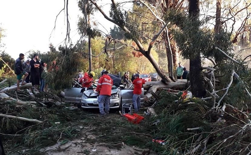 De imediato se deslocou uma viatura de atendimento pré-hospitalar e uma unidade de resgate para o local, onde foi encontrado o referido acidente, onde uma arvore da espécie eucalipto de grande porte não resistiu a força do vento e caiu sobre um veÃculo, que transitava na via.